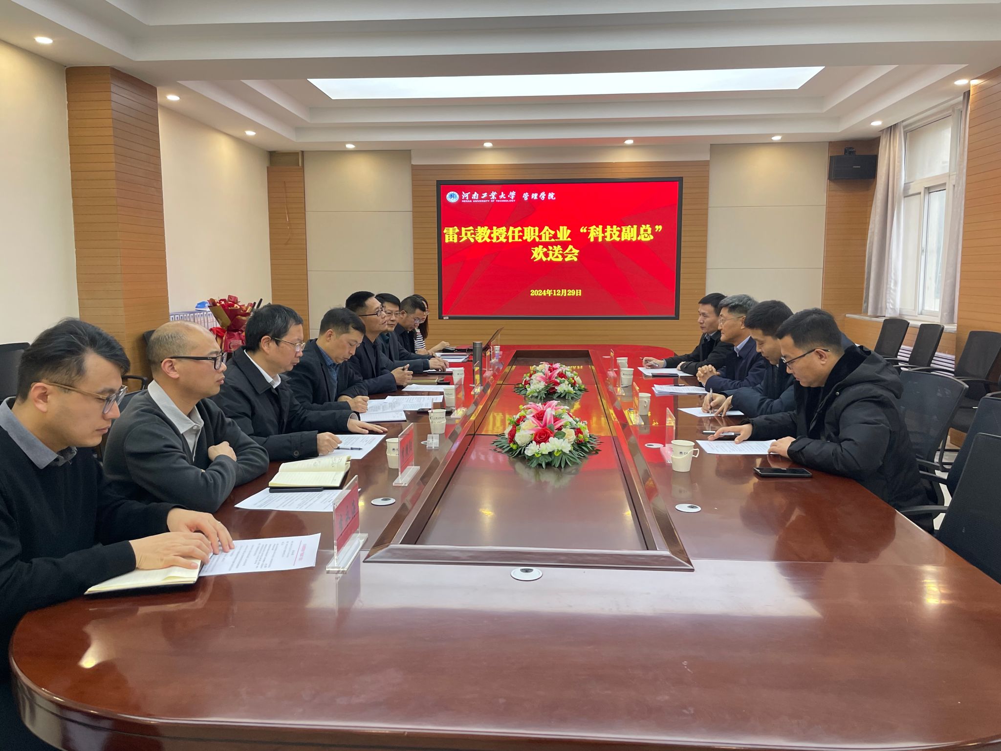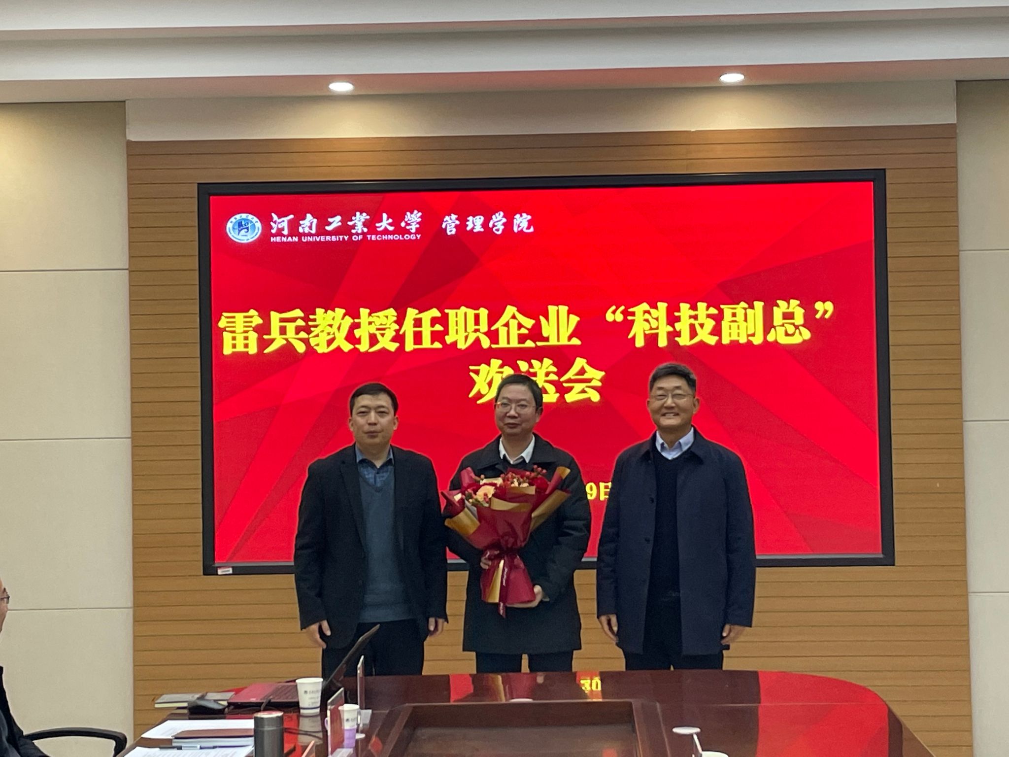 和河南君友的感谢之情,并表示将在“科技副总”岗位上充分发挥专业优势,将教学科研成果转化为企业生产力,为新的岗位贡献力量。随后,学院为雷兵教授举行了简短而温馨的欢送仪式。