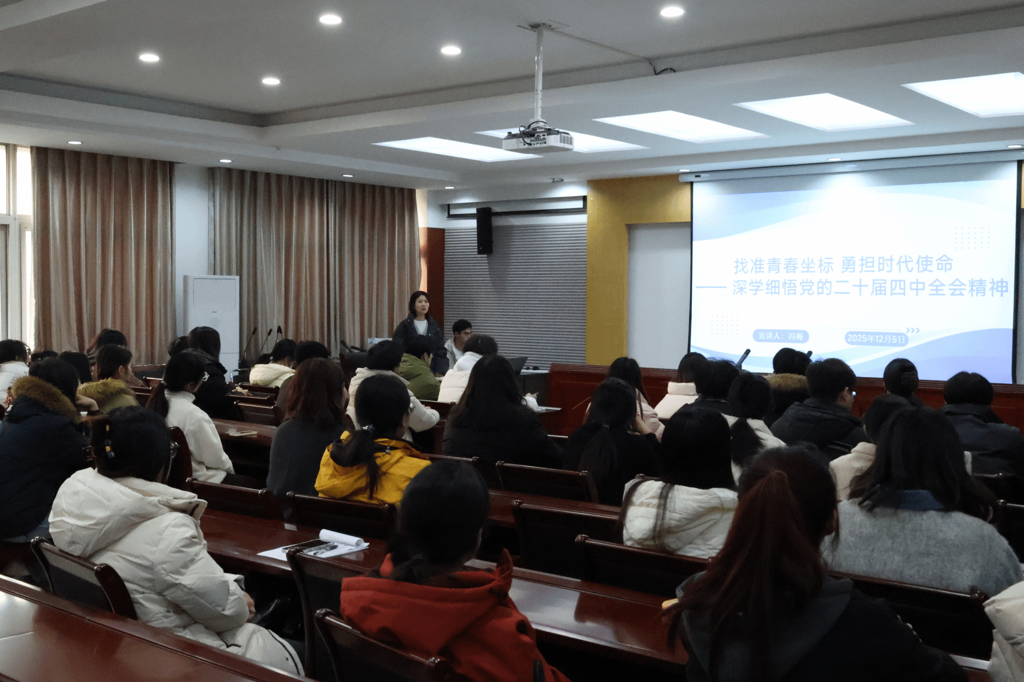12月5日,冯梅以“找准青春坐标 勇担时代使命——深学细悟党的二十届四中全会精神”为主题开展宣讲,从“关键节点”“核心目标”“青年角色”三个关键词切入,指出当前国家发展关键期与同学们学业职业转换期高度契合,号召学子将个人成长融入国家大局。她同时鼓励大家把“共同富裕”“安全发展”理念落到实处,比如组队帮助同学补短板、报名参与“三下乡”实践活动。最后,她倡导大家做“踏实学习的学习者、练就真本事的追光者、埋头干事的践行者”,以实干深耕大学时光、提升自我,为青春交上满意答卷。