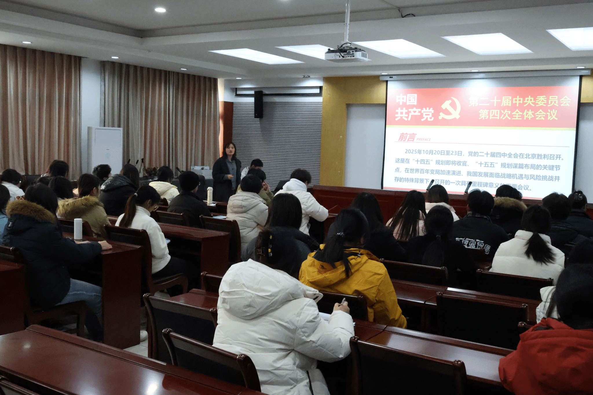 ,12月4日和12月5日,于博识楼3543会议室开展专题宣讲。两位老师分别从不同视角切入,围绕核心精神与实践要求展开深度解读,为23级全体党员、预备党员及学生干部代表带来了两场兼具思想深度与现实指导意义的宣讲报告。