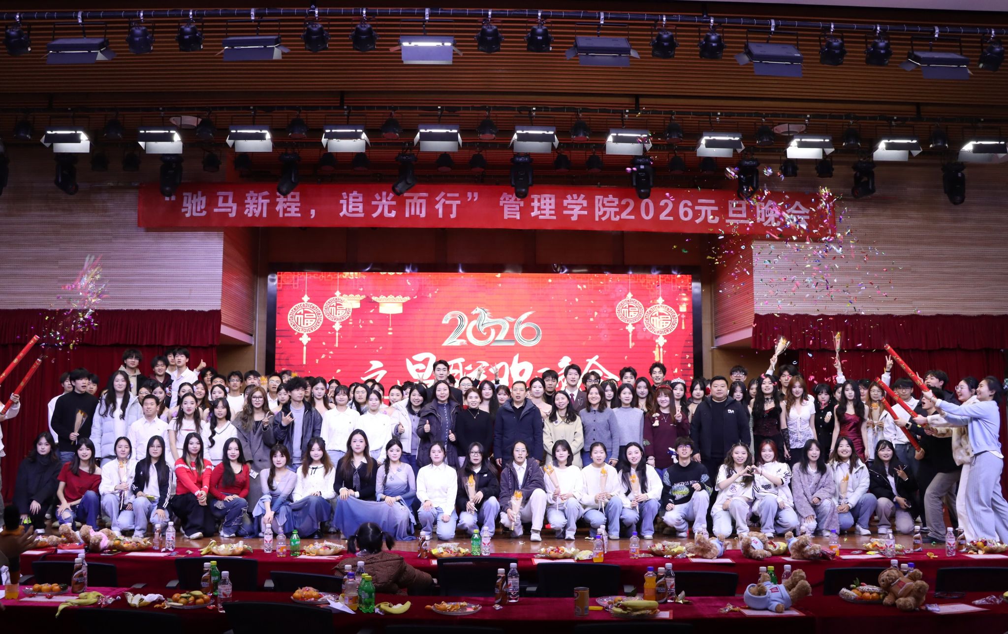 整场晚会节目精彩纷呈、形式多元,每一个作品都彰显着管理学子的青春风采与家国情怀。街舞《跃动ZOOTOPIA》以灵动洒脱的舞姿诠释蓬勃朝气,瞬间点燃现场氛围;歌曲串烧《小酒窝》《特别的人》等经典曲目,用深情婉转的歌声唤起青春共鸣,引发全场轻声合唱;中国舞《一条大河》舞姿柔婉、意境悠远,手语操《国家》动作整齐、情感真挚,两种表演交相辉映,抒发了青年学子对祖国的赤诚热爱;诗朗诵《青春逐梦,管理启航》字字铿锵、句句有力,道出了管院学子不负韶华、勇毅前行的奋斗誓言;走秀《礼序焕新》尽显时尚格调,以利落造型与自信姿态,展现出新时代大学生的飒爽风姿;拉丁舞《Sun Never Sets》节奏热烈、动感十足,传递出永不褪色的青春活力。压轴登场的大合唱《稻香》温情满溢,熟悉的旋律带领全场师生重温美好时光,将晚会氛围推向高潮,也为本次元旦晚会画上了圆满的句号。全程掌声与欢呼此起彼伏,暖意与激情在现场久久回荡。