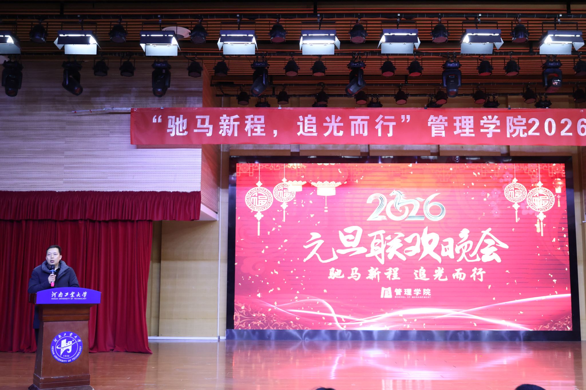 “驰马新程,追光而行”2026年元旦晚会在25201活动厅温情启幕。校党委学工部部长王迪,就业创业中心主任周志强、副主任王萌,校团委副书记李凯歌莅临晚会现场指导,学院党委书记李国仓、院长李凤廷、党委副书记曹启娥、全体辅导员老师、教师代表及现场观众共400余人齐聚一堂,共赴这场青春洋溢的文化盛宴。晚会由王晓航、谢亚烔、李响、郭润泽四位同学联袂主持。
