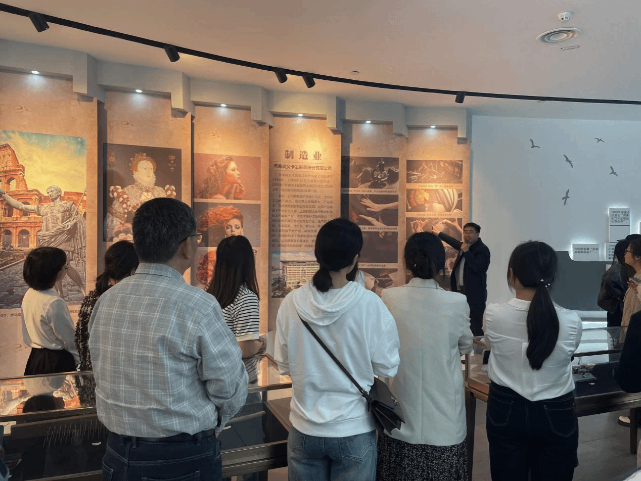 第二站来到河南瑞贝卡发制品股份有限公司,瑞贝卡是一家集发制品及纤维材料的研制、开发、生产、销售于一体的全球生产规模最大、品种最全的发制品专业公司。瑞贝卡重视自主创新,建有河南省发制品工程技术研究中心、国家级企业技术中心、国家级生产力示范促进中心、博士后科研工作站、假发纤维院士工作站、上海纤维材料研究所等研发机构,瑞贝卡是行业内首家“高新技术企业”。在工作人员的讲解下,2023级MBA师生为瑞贝卡始终坚持奋斗底色和创新驱动、将“一根发丝”做到极致的企业精神深感振奋,同时为其在社会公益、生态环境、绿色发展等方面的非商业贡献深深感动。