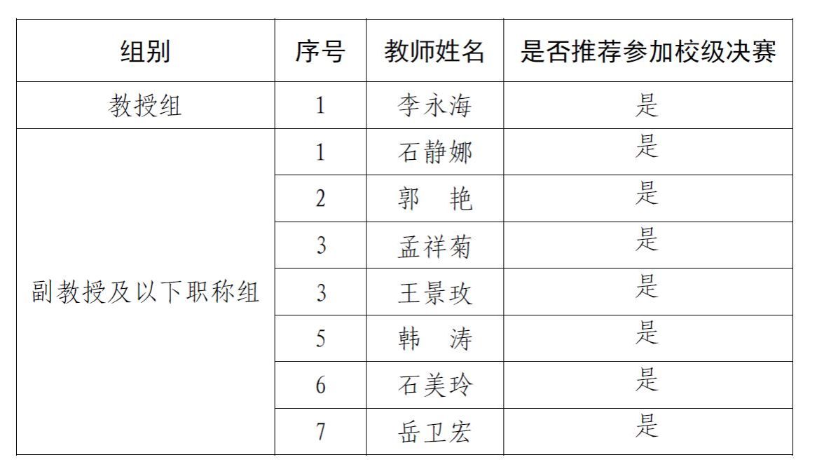 “第十三届教学大奖赛”竞赛活动实施方案》,经教师个人申报、各专业推荐,本着公平、公正和公开的原则,学院组织了初赛评审,依据成绩,推荐8名教师(教授组1名、副教授及以下职称组7名)参加校级决赛,具体推荐名单见附件所示。