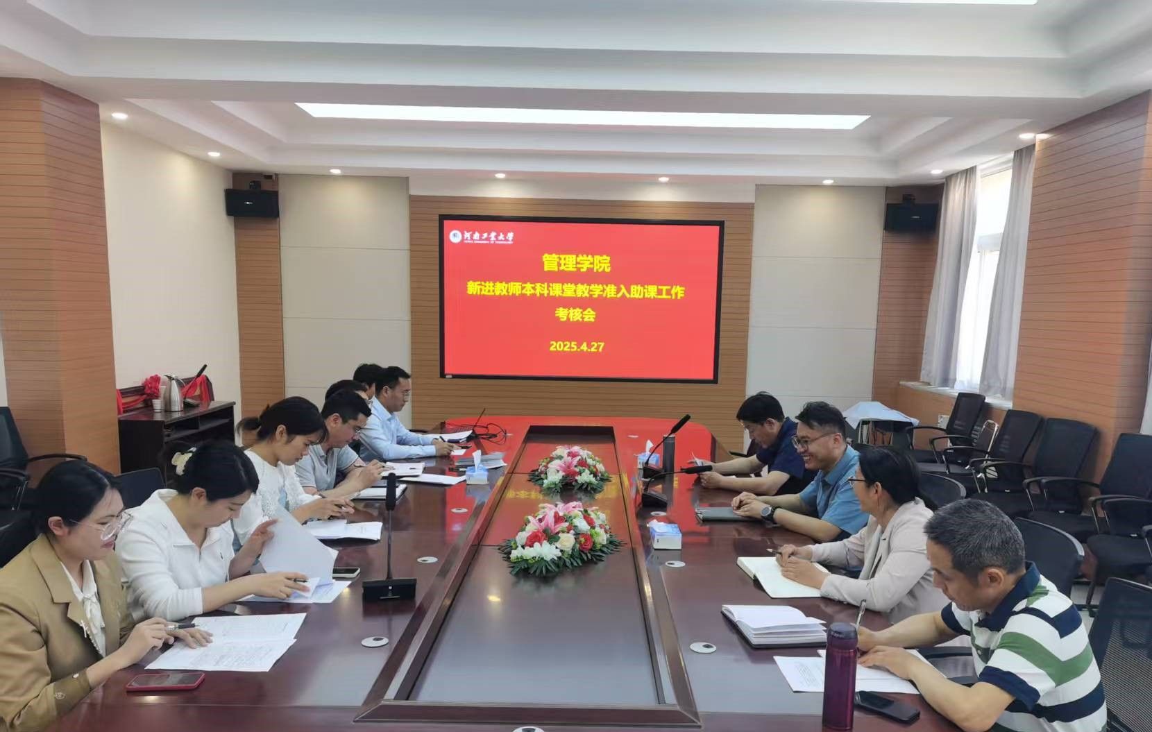 于4月25日在学院会议室开展2024年度新进教师本科课堂教学准入考核会。副院长韩江主持会议,会计系主任袁晓波、电子商务系主任李永海、工商管理系主任石美玲、物流管理系党支部书记王琳组成专家评审组,对7位新进博士教师进行全面考核。