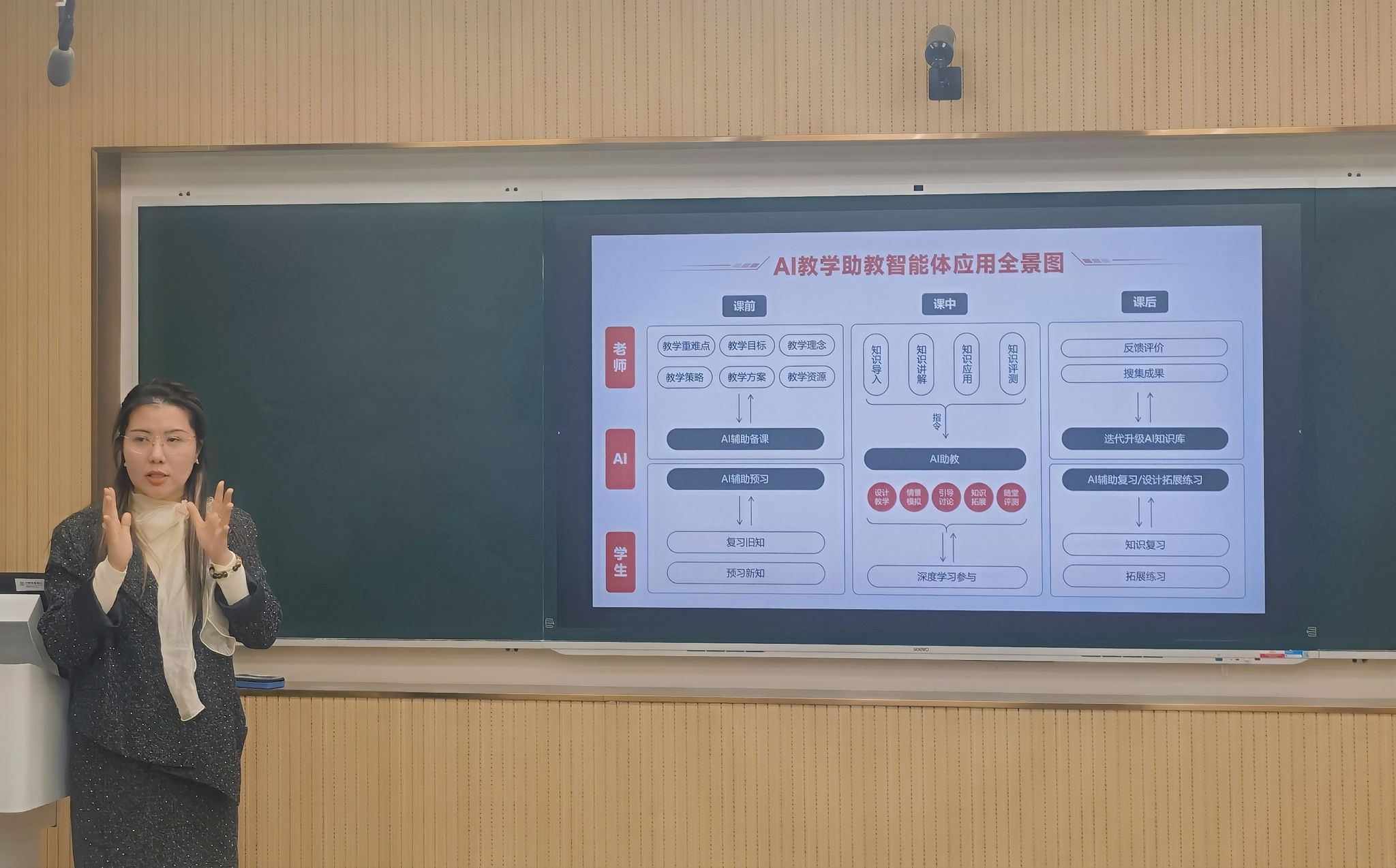 上午,吕丹教授以《跨境电子商务》课程为典型案例,紧密结合武汉轻工大学跨境电子商务产业学院的实际建设情况,详细且深入地分享了该课程在产教融合方面的具体实施举措、关键环节以及取得的显著成效。下午,吕丹教授聚焦“AI赋能高校教师教学创新”主题展开全面讲解。她先介绍了常用AI工具箱和AI智能体的基础概念,为教师搭建起对AI工具的初步认知框架;接着深入讲解如何运用AI工作流开发教学工具,以及AI提示词公式的具体使用方法,助力教师掌握实操技巧;随后详细阐述了AI大模型在备课、教学、评测等教学环节的应用,为教师提供教学新思路;最后展示了AI智能体的多元教学场景,让教师直观感受AI在教学中的创新应用。工作坊期间,学院教师与吕丹教授积极互动、热烈研讨,进一步提升了工作坊的实际效果。