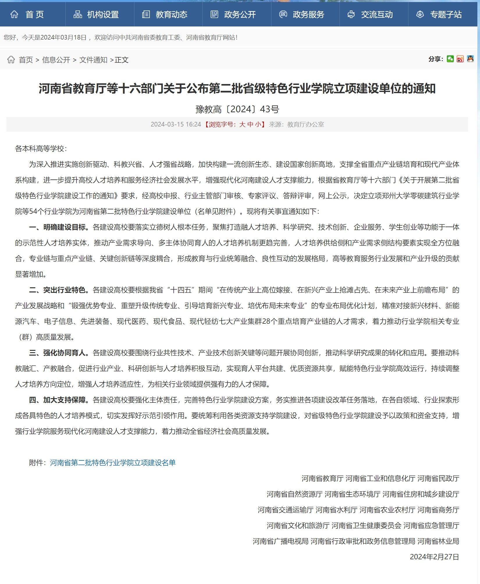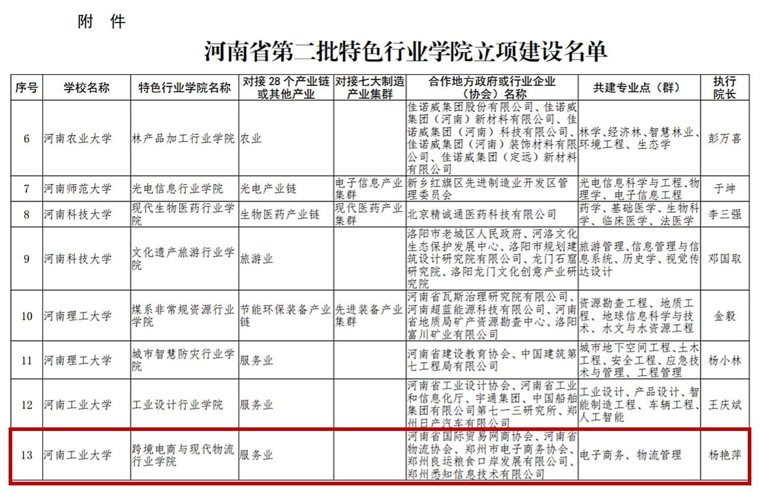 近日,河南省教育厅、河南省工业和信息化厅、河南省民政厅等十六部门联合发布了《关于公布第二批省级特色行业学院立项建设单位的通知》(豫教高〔2024〕43号),我院申报的“跨境电商与现代物流行业学院”获批立项建设。