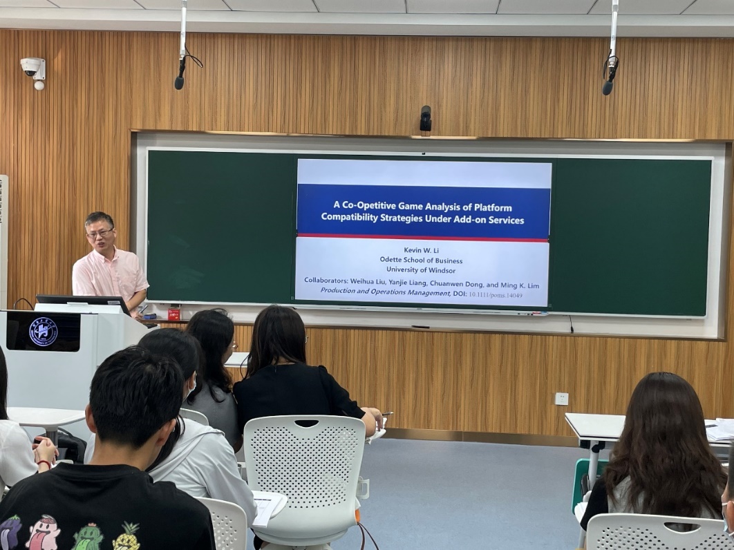 9月17日上午,电子商务与商务智能科研创新团队学术交流活动在3227智慧教室举行。加拿大温莎大学Odette商学院李武教授受邀作题为“高水平学术论文写作以《A Co-Opetitive Game Analysis of Platform Compatibility Strategies Under Add-on Services》为例”的学术讲座。电子商务与商务智能科研创新团队教师及研究生80余人参加了本次讲座。