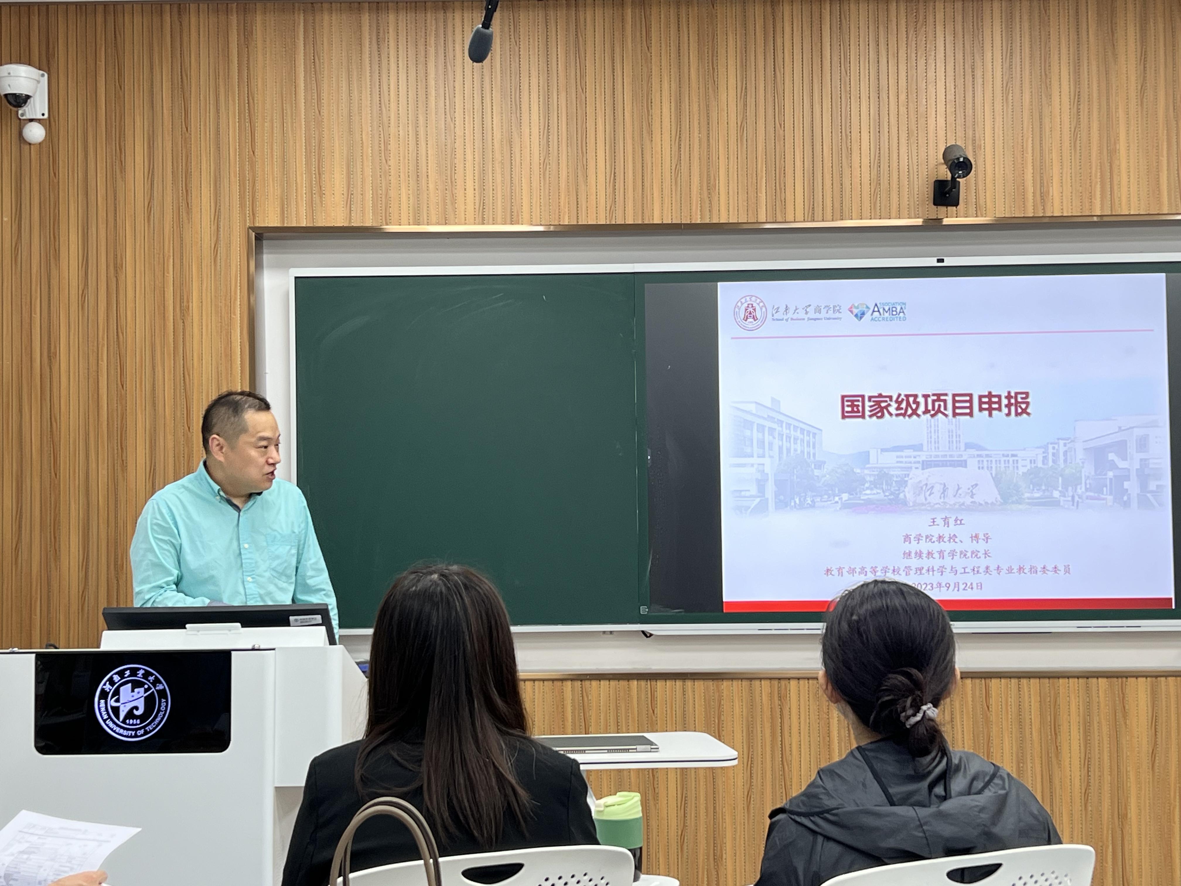 首先,肖开红代表学校学院对王教授的到来表示热烈的欢迎和衷心的感谢,并简要介绍了社科创新团队建设情况。随后,王育红教授以江南大学人文社科纵向项目汇总信息作为切入点,深入分析了国家级项目申报关键影响因素,探讨选题立论的依据,研究的目标与内容、方法与路线、基础与团队等关键问题。以“关于供应链的一个项目”为例,从凝练科学问题、明确研究目标等方面,介绍了如何定位研究内容及其关键问题。最后,王教授分享了论文写作、团队组成、经费申请等经验,并对老师提出的论文写作、投稿方面的遇到的问题进行了具体的解答。