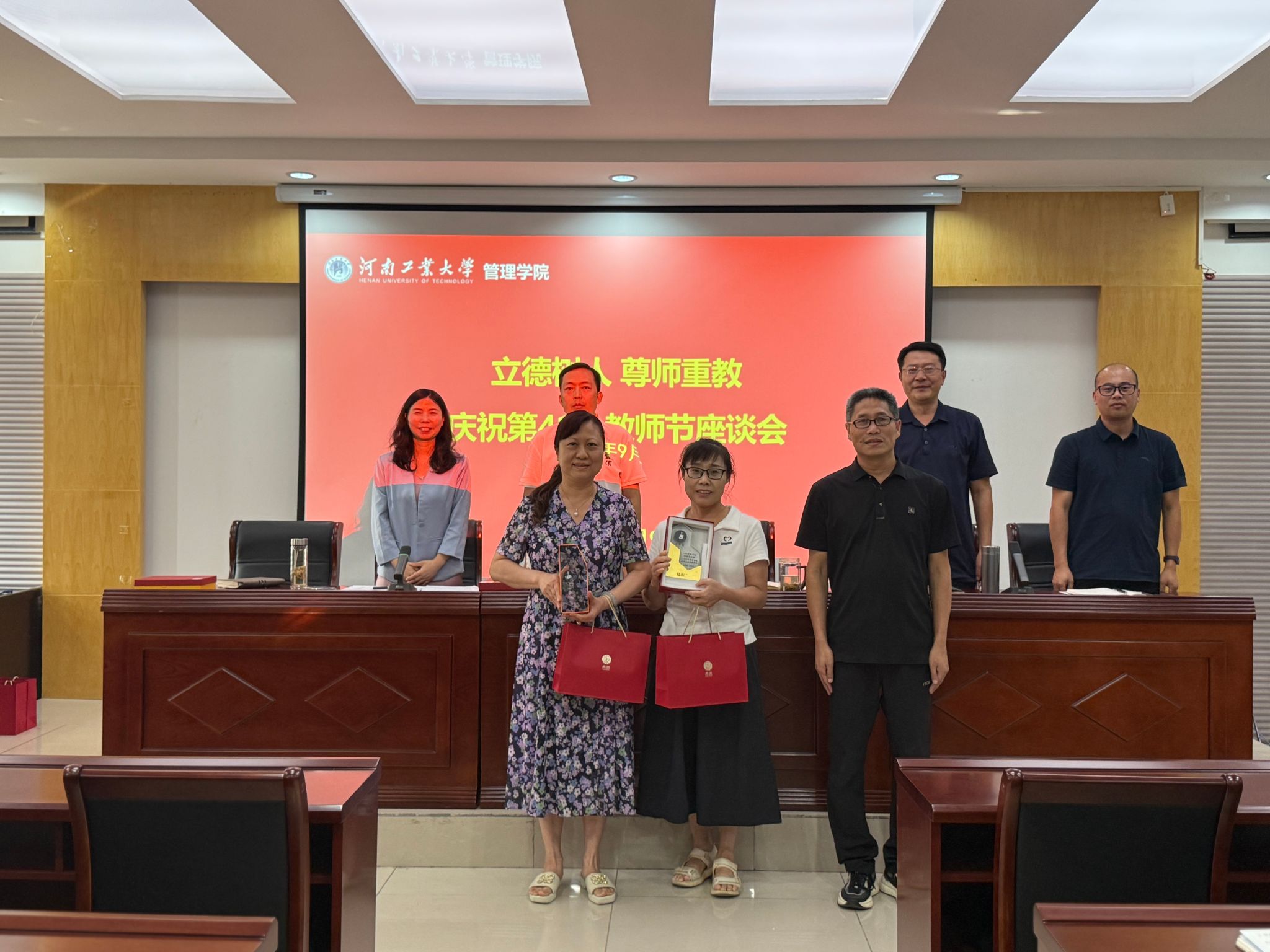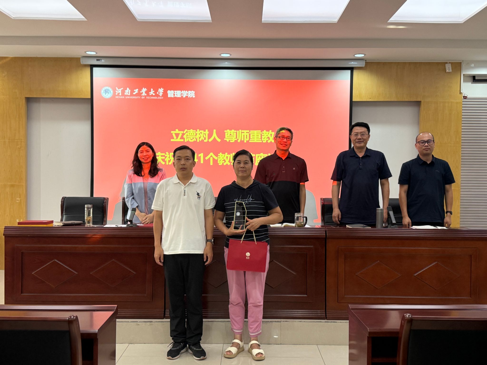 活动在深情的致辞中拉开帷幕。学院领导班子按照教师从教5年、10年、20年、30年、35年、40年分别为相关教师颁发精心定制的纪念杯和纪念品。每一段岁月,都是一首无声颂歌;每一枚纪念章,都是一段教育史话。现场掌声如潮,情感涌动。受表彰的教师眼中闪烁着激动与坚定,心中回忆着从教以来的点滴过往。他们以讲台为舟、以岁月为桨,渡人无数,亦照亮了自己作为教育者的星辰大海。学院借此寄语全体教师:愿此纪念成为新起点,于教育长河中继续坚守初心,书写育人新华章。暖心不止于表彰,关怀亦在细节中流淌。活动中,郑州方一坤实业集团有限公司执行总裁宋东方先生亲临现场,代表企业向全院教职工致以节日问候,并为全院教职工专程送上精细准备的方一坤套餐券。这一份弥漫“烟火气”的礼物,代表着企业对教师职业的尊重,传递着社会对教师的关怀。