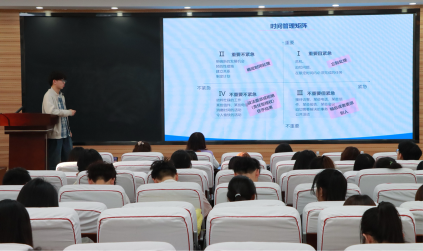 宣讲会上,四位宣讲成员分别从学科竞赛、社会实践、科技创新和学生工作四个方面分享了自己的学习经验与成长收获。国际教育学院张亚博采用"五育并举"成长模型,通过"德智体美劳"全景式经验分享,结合自身获奖经历,现场开展互动问答,解密"学习力提升三部曲";法学院安田雨以科研竞赛和社会实践为切入点,展示了自己科研方面的优秀成果,以实际行动践行社会主义核心价值观,生动诠释新时代青年知行合一的精神风貌。