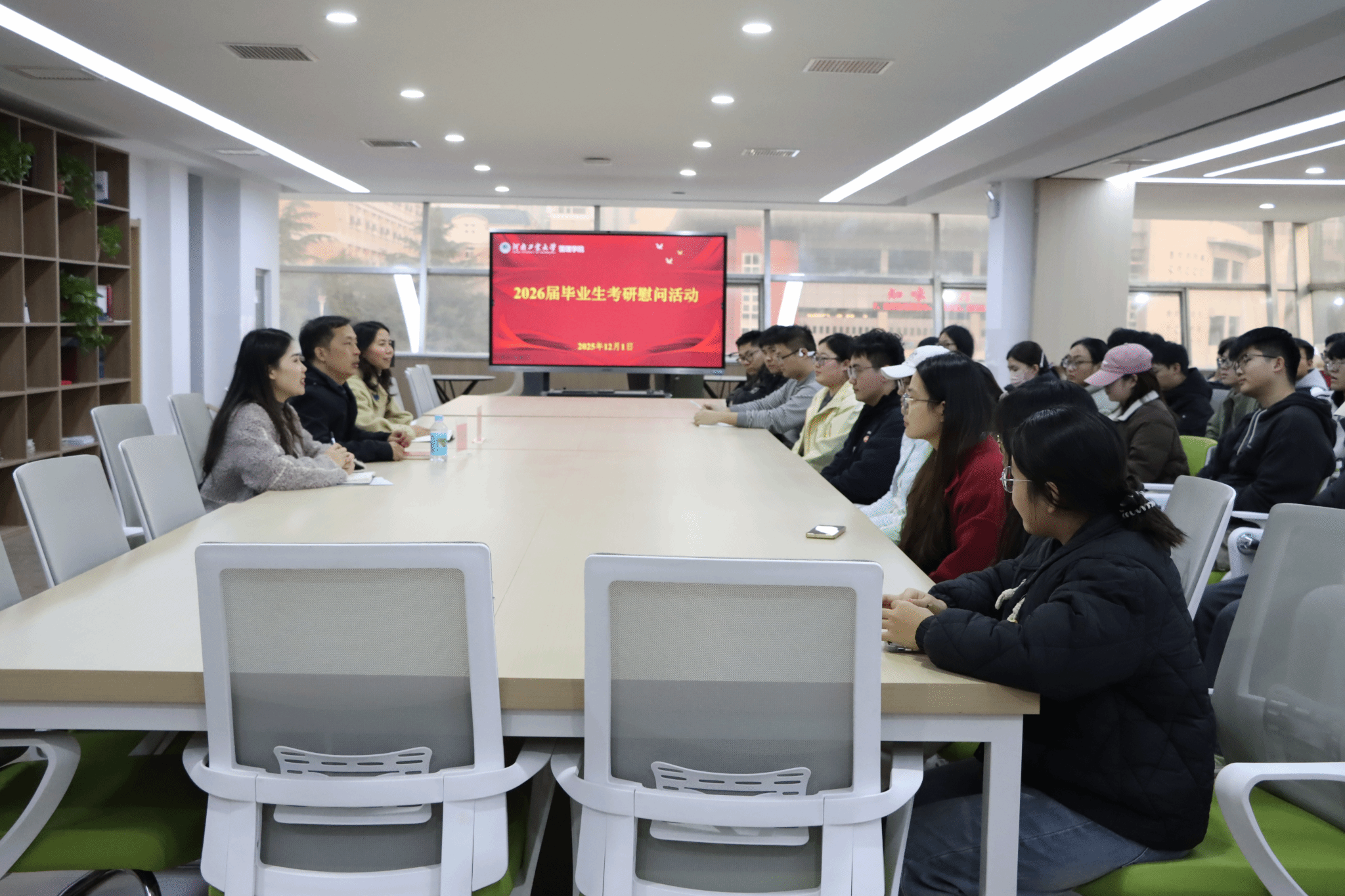 在德园“一站式”学生社区开展2026届毕业生考研慰问活动,学院党委书记李国仓、党委副书记曹启娥及考研学生代表参加,活动由学院团委书记、22级辅导员郑媛媛主持。
