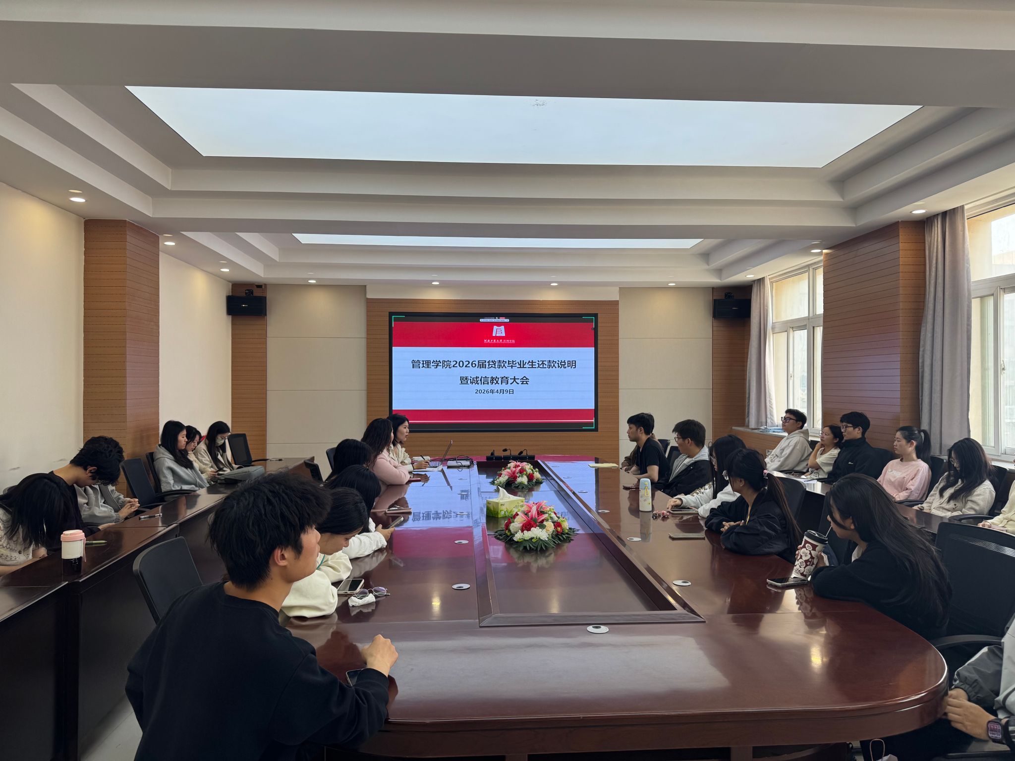 在博识楼3558会议室召开2026届贷款毕业生还款说明暨诚信教育大会。学院学工办主任王风云、资助负责老师冯梅、资助助理及2026届贷款毕业生参加本次会议。会议采用线上线下相结合的方式开展,由冯梅主持。