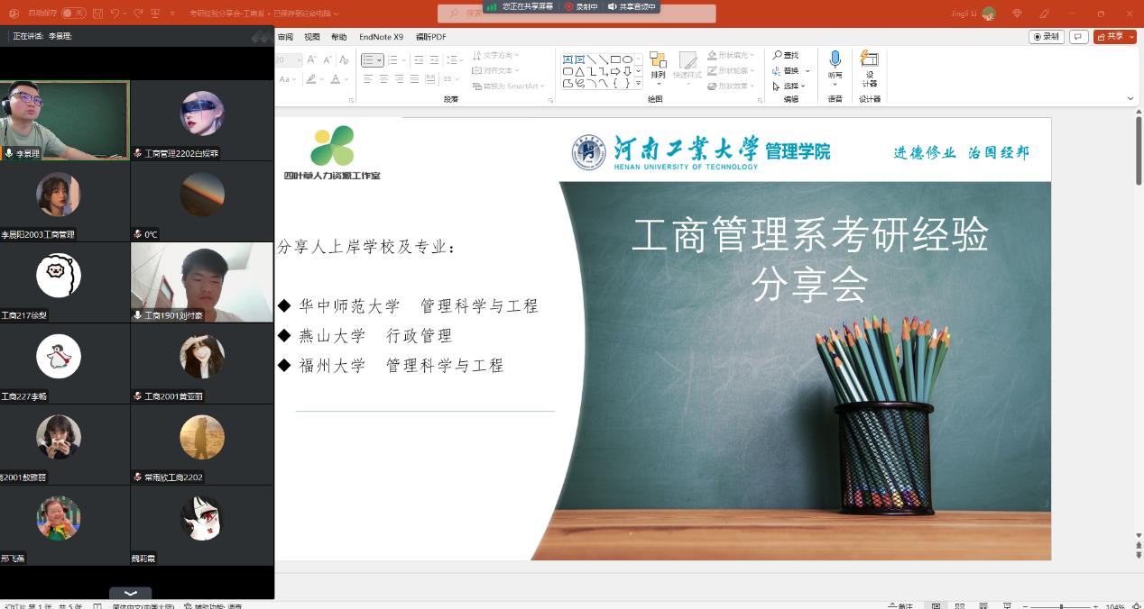 6月10日,工商管理系联合四叶草人力资源工作室,在线举办了一场精彩纷呈的考研经验分享会,活动吸引了众多同学的积极参与。会议由系副主任李景理主持。考入华中师范大学管理科学与工程专业的王彬、燕山大学行政管理专业的刘欣瑶以及福州大学管理科学与工程专业的刘付豪向同学们分享了他们的备考经验和心得,引起了考研学生的广泛好评。