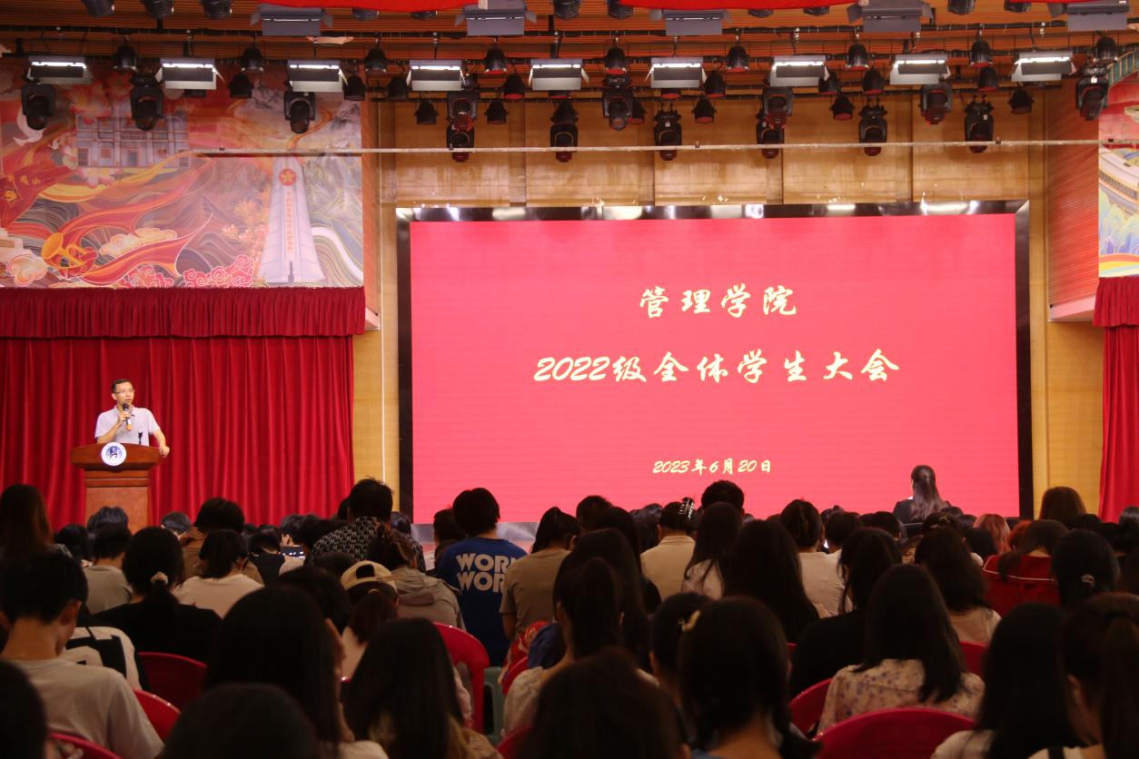 会上,魏涛代表学院对2022级学生搬迁至莲花街校区表示热烈的欢迎,也希望大家心存感恩,不要忘记过去一年,特别是疫情期间,嵩山路校区、明德书院全体领导教师对大家的谆谆教诲和无私奉献。同时,他希望全体学生在接下来的三年大学生活以及未来发展中,做一个有情有义、有说有笑、有条有理、有度有识的管院人。郑媛媛对2022级新生送出了衷心的祝福,希望大家做好学业规划、职业规划,度过充实美好的大学生活。