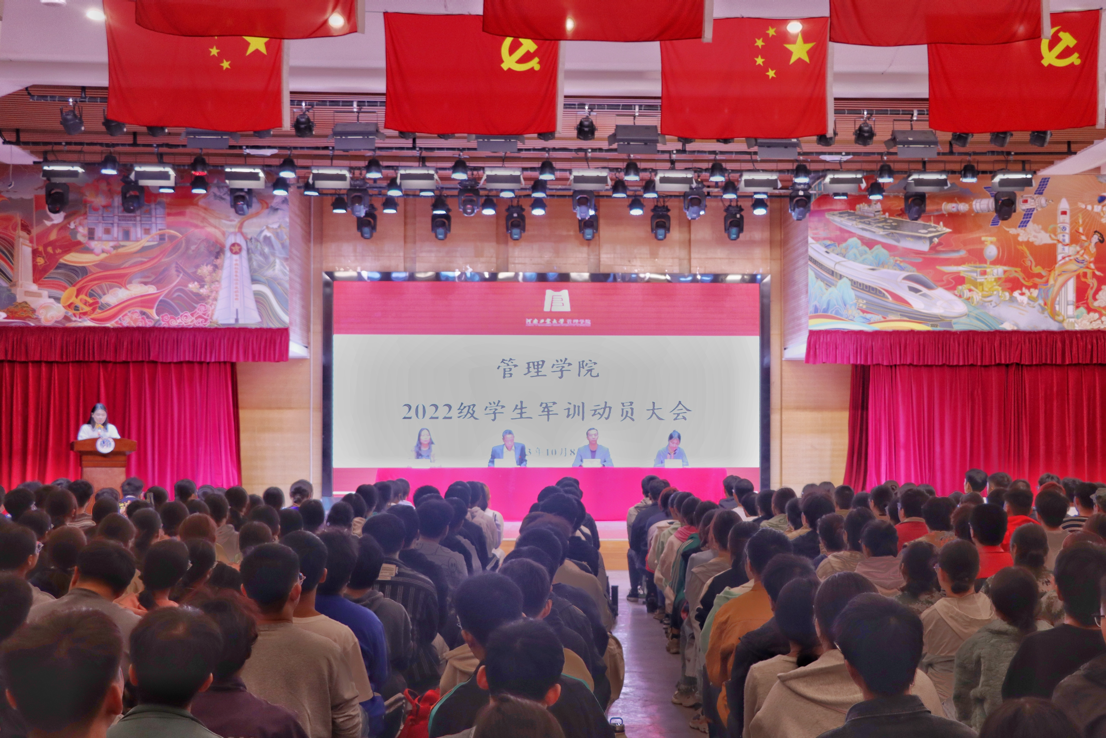 在25201活动厅举行2022级学生军训动员大会。学院党委书记魏明侠、党委副书记魏涛、学工办主任王风云、团委副书记兼2022级辅导员郑媛媛、辅导员刘丽、带训教官及2022级全体学生参加动员大会,大会由郑媛媛主持。