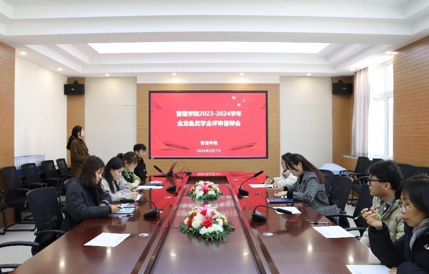 在3558会议室召开2023-2024学年金龙鱼奖学金评审答辩会。学院学工办主任王风云、团委副书记郑媛媛,全体辅导员、班主任代表、院学生资助评审小组成员、学生代表参加此次答辩会。会议由尹晓栋主持。