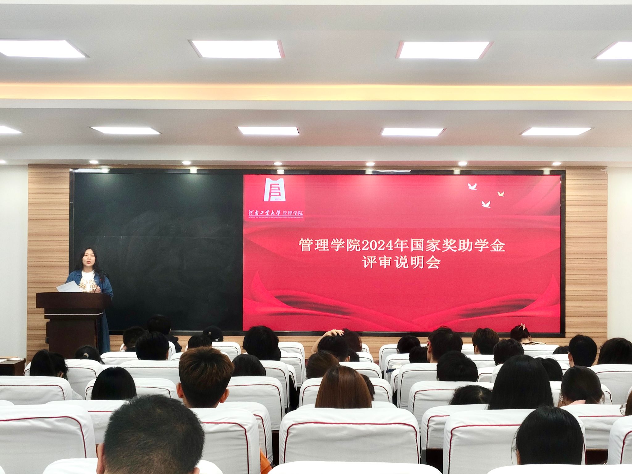 在3428会议室召开2024年国家奖助学金评审说明会,学院学工办主任王风云、2023级辅导员冯梅、资助助理及各年级学生代表参加会议。