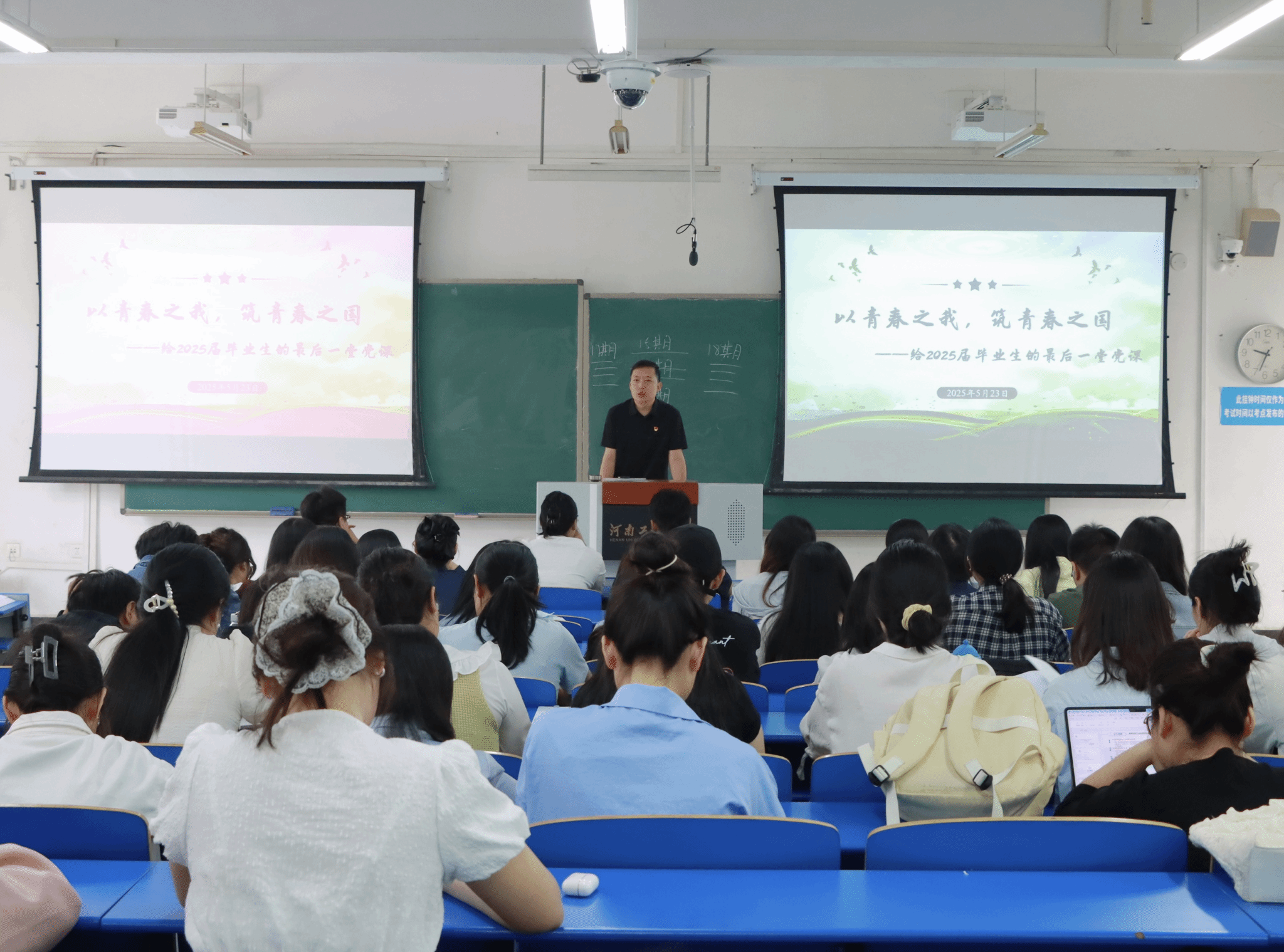 在博识楼3224教室召开2025届毕业生党员离校教育大会,学院党委书记李国仓给毕业生党员上最后一节党课。2025届全体毕业生党员参加会议。大会由学院团委书记郑媛媛主持。
