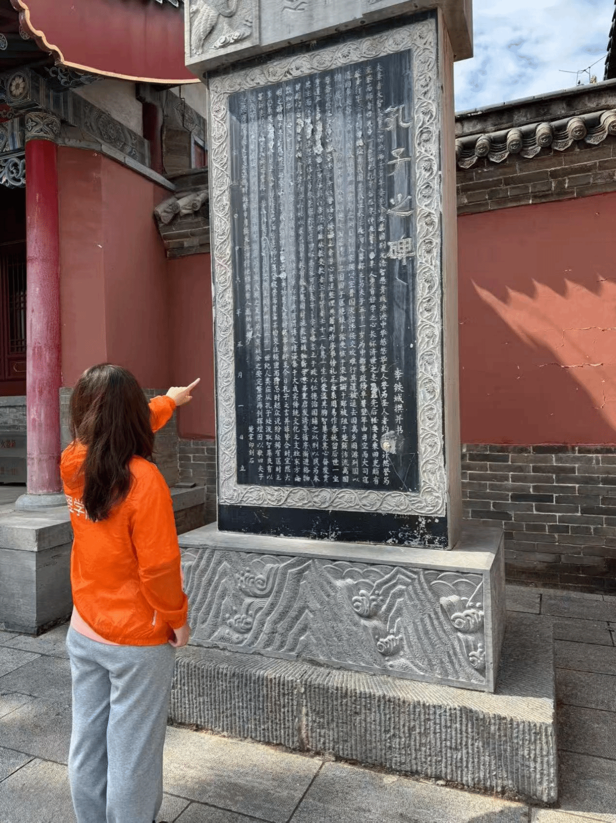 实践队员们身着统一队服,步入这座承载千年文脉的古建筑群。在精心布置的展陈空间内,数字投影技术生动还原了古代车舆场景。队员们驻足其间,通过光影变换直观感受古代礼仪制度与交通文明,仿佛穿越时空,触摸到历史的脉搏。队员们移步至供奉儒家圣贤的神位前,“亚圣孟子”、“宗圣曾子”等先贤塑像庄严肃穆,屹立于此。队员们怀着敬意驻足瞻仰,低声交流着先贤的生平与思想贡献,在静默与思考中体悟“仁、义、礼、智、信”等核心价值理念的永恒魅力。最后实践的重点落在矗立的“孔子之碑”前。队员们围拢在石碑周围,仔细辨认、研读斑驳的碑文。带队老师现场讲解了碑文的历史背景与儒学传承脉络,实践团队成员从字里行间追溯儒家思想千年不绝的源流,感受中华文明深厚的根基。不仅使实践团队对儒家思想有了更深入认知,更激发了团队成员的反思 。