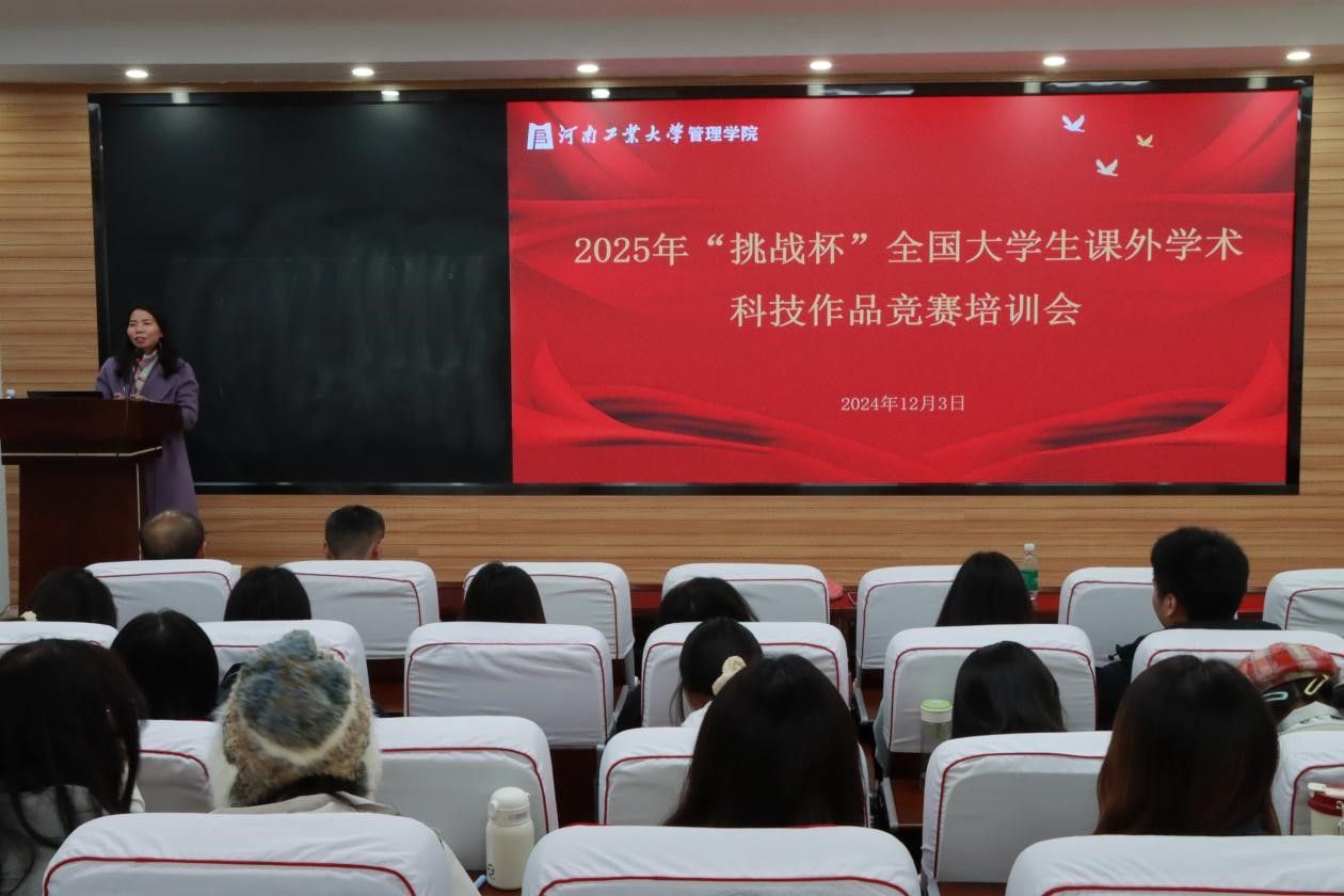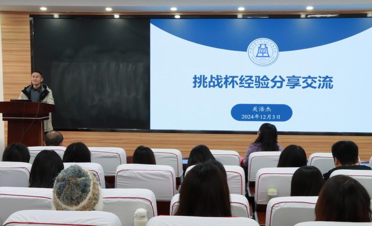 在3428报告厅召开培训会,会议特邀在“挑战杯”赛事指导方面深耕多年、经验丰富的专家——经济贸易学院关浩杰老师进行培训,学院党委副书记曹启娥及2025年“挑战杯”参赛队伍全体成员参加会议,会议由学院团委书记郑媛媛主持。