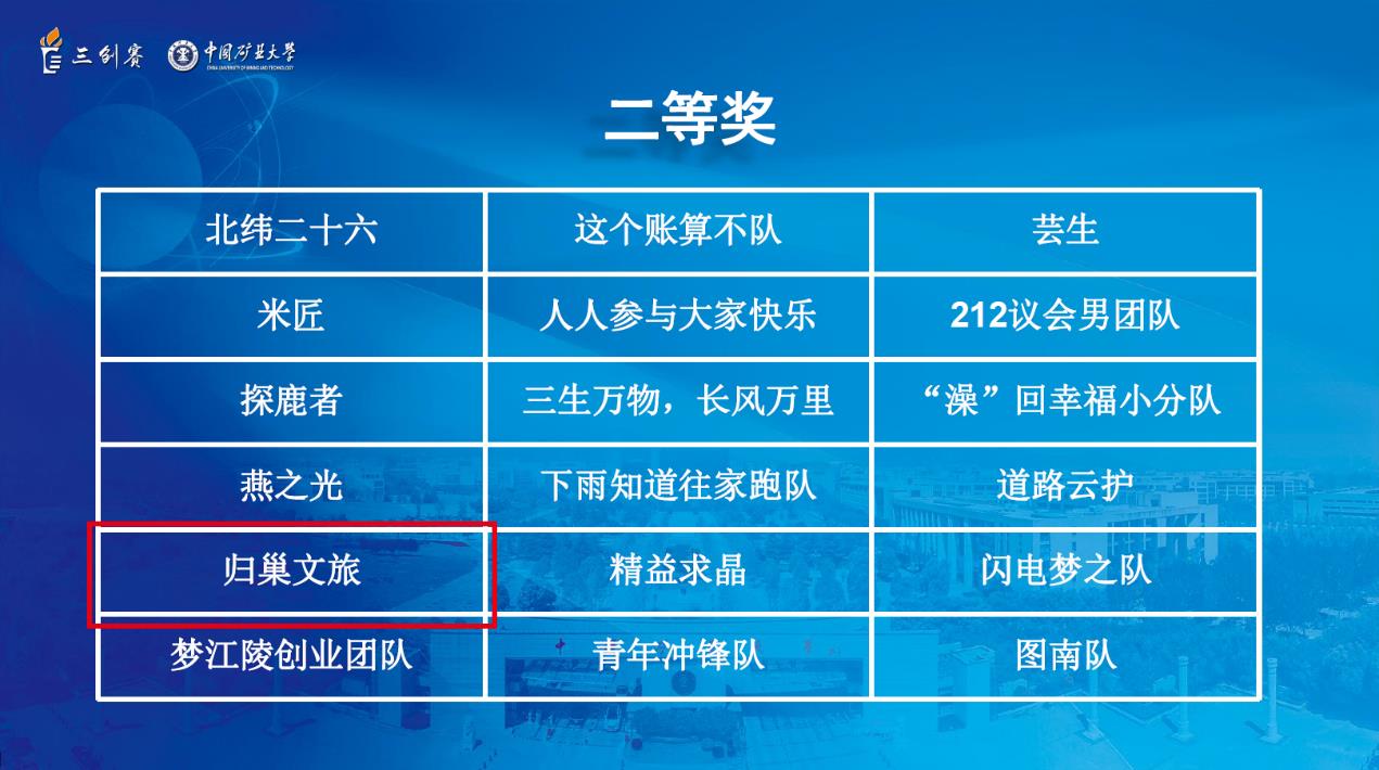 王景玫、李朝阳老师指导,学生付若瞳、方诗妍、袁鹏冲、郭辉煌等组成的“归巢文旅”团队喜获全国总决赛二等奖。
