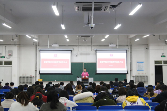 于3月9日晚上在3135教室举办2018级考研指导大会,学工办主任吴若旻、天任教育集团商学院院长周常江出席本次会议,2018级全体学生参加本次活动。