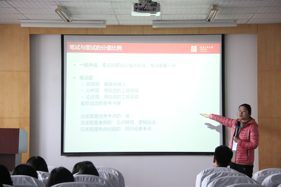 王伟进行复试和面试相关问题讲解。她首先向同学们提出“笔试重要还是面试重要”、“笔试应该看什么?”“面试中自我介绍和预测问题孰轻孰重”等问题,由此总结出多条实用技巧。比如,要着重自我介绍是关键环节,并结合往年优秀学生面试案例给予详细讲解。